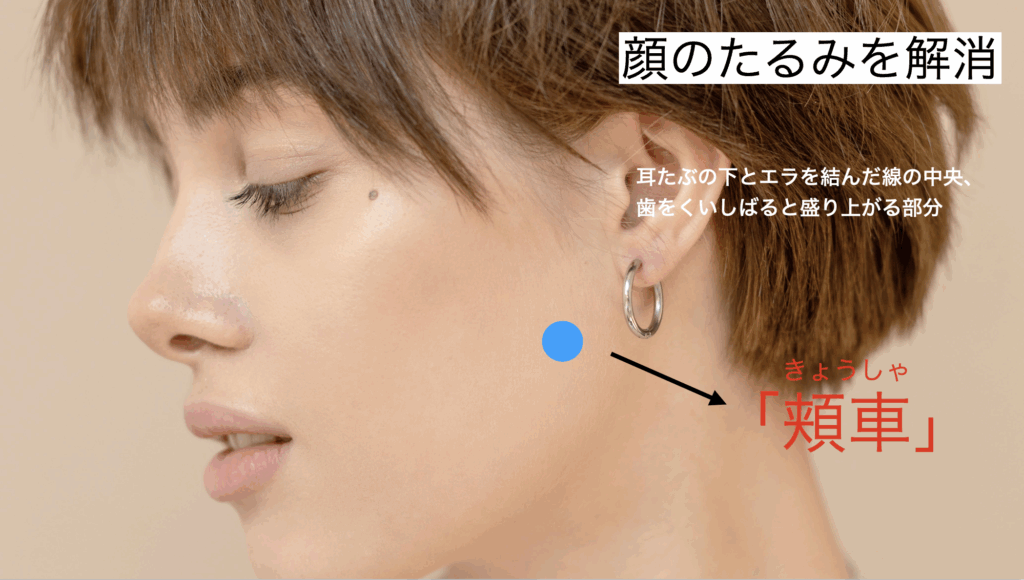 ここは食べ物を噛むときに使う**「咬筋(こうきん)」**の真上にある重要なツボ。鍼灸師の視点では、食いしばりやストレスで凝り固まった咬筋を直接ゆるめることで、フェイスラインのもたつきを解消し、シャープな印象に導く効果が期待できます。エラ張りが気になる方は必須のツボです!