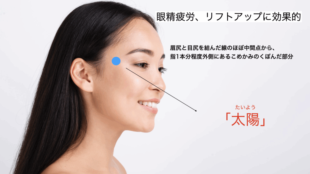 ここは「眼精疲労の特効穴」として有名ですが、実は顔全体のリフトアップにも欠かせないツボ。側頭筋という大きな筋肉につながっており、ここをほぐすことで目元がパッチリするだけでなく、頬のたるみをグッと引き上げる効果が期待できます。