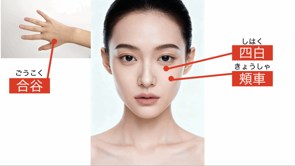 ・合谷(ごうこく):手の甲、親指と人差し指の間