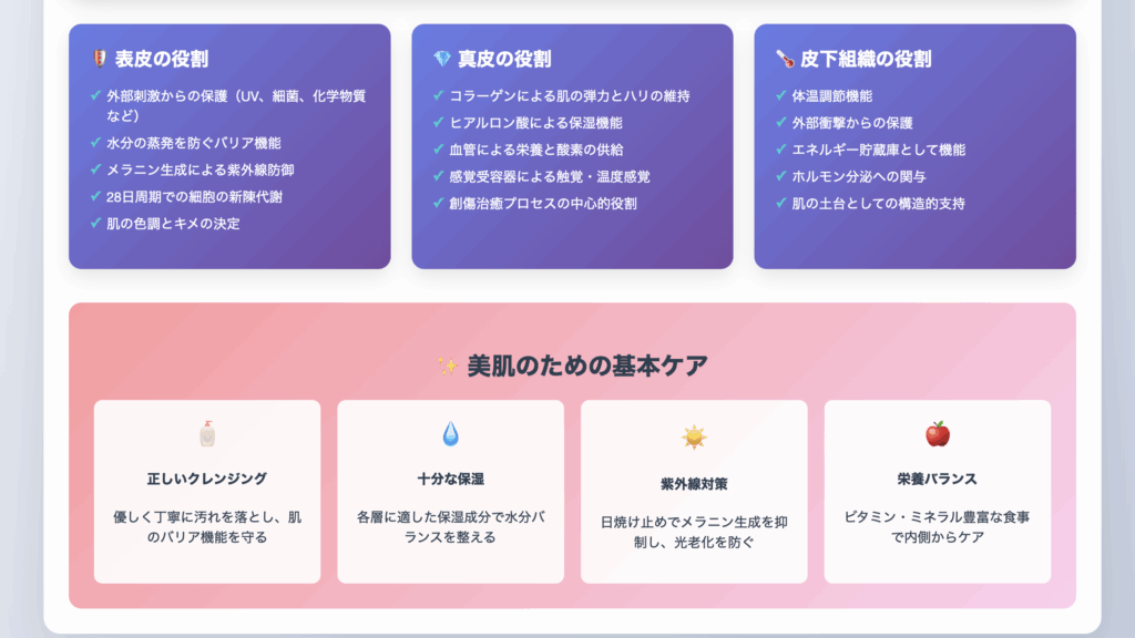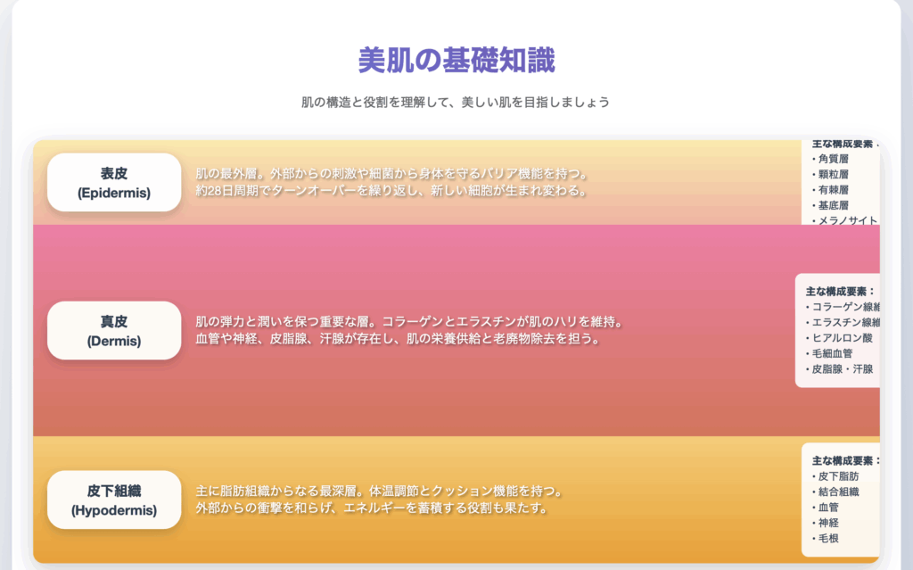 美肌を目指すためには、まず肌の構造を理解することが大切です。私たちの肌は「表皮」「真皮」「皮下組織」という3つの層から構成されています。